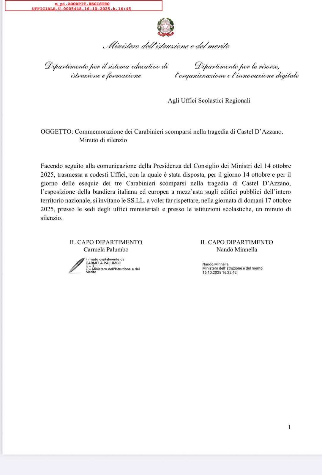 Si comunica che domani 17 ottobre 2025 verrà osservato un minuto di silenzio alle ore 10:30 presso le sedi degli uffici ministeriali e le istituzioni scolastiche per commemorare i Carabinieri scomparsi nella tragedia di Castel D’Azzano.