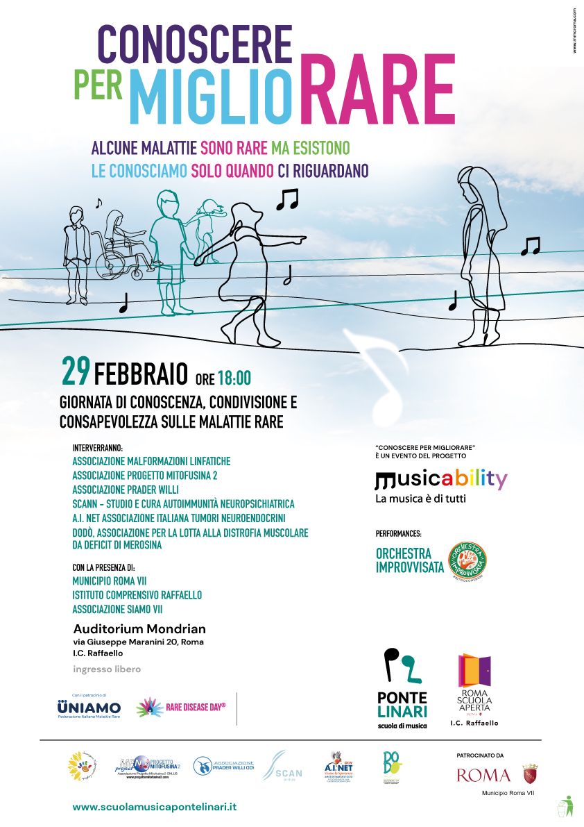 Evento realizzato dalla scuola di musica Ponte Linari in occasione della giornata per le malattie rare il giorno 29/02/24 alle ore 18.00 presso l’auditorium dell’I.C. Raffaello, Via Maranini, 20.
