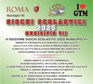 Domenica 18 maggio alle ore 12,00, nel corso della XXIII Maratonina al parco della Romanina, sito in Via Luigi Schiavonetti snc, si svolgerà la premiazione dei GIOCHI SCOLASTICI 2025 MUNICIPIO VII.